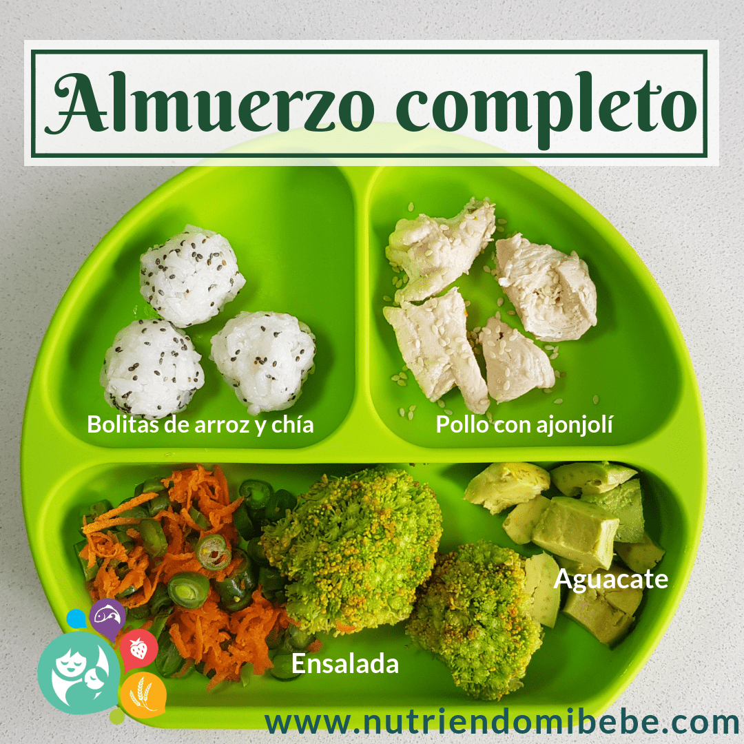 Un almuerzo completo en muy poco tiempo, nada super elaborado. Puedes hacer formas sencillas que llamen la atención del niño como las bolitas de arroz y su vez facilitas la manipulación de los niños mas pequeños.