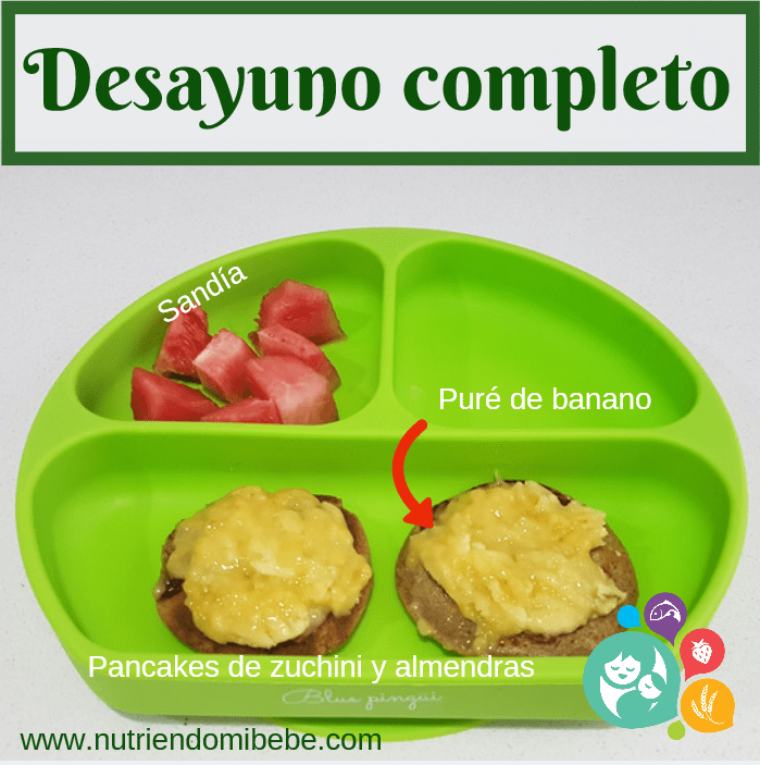 Este desayuno contiene: – Sandía (fruta) – Pancakes (harina de avena + zuchini + almendras+ huevo + un poco de polvo de hornear) – Puré de banano.