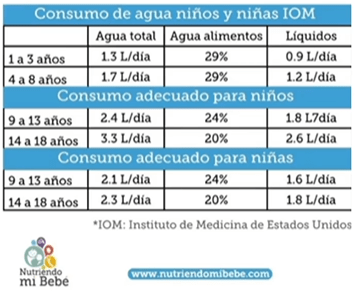 La OMS (Organización Mundial de la Salud) recomienda lactancia materna exclusiva desde el nacimiento y hasta los 6 meses de edad, sin dar ningún otro líquido (incluyendo el agua) o alimento hasta iniciar la alimentación complementaria. Una vez iniciada la alimentación complementaria, se inicia el consumo de agua buscando crear el hábito del consumo. Además, también es importante por la regulación del tránsito intestinal; ya que el niño ingiere alimentos diferentes a su lecha materna o formula infantil y esto implica mayor cantidad de alimento sólidos en su dieta.